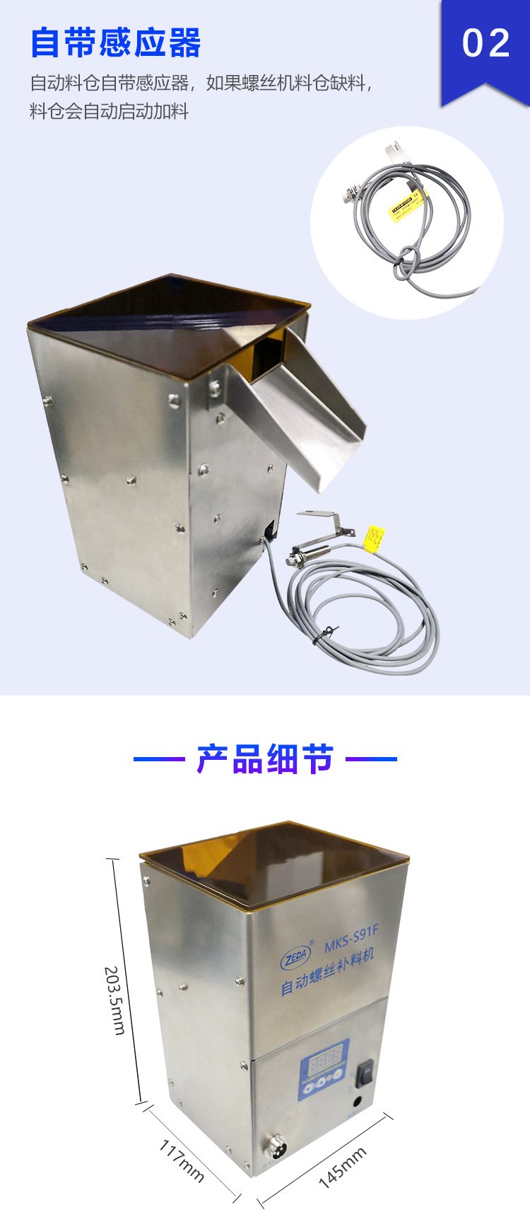 2、自動料倉(HOPPER)自帶感應器,如果螺絲機料倉缺料,自動料倉會自動啟動加料;