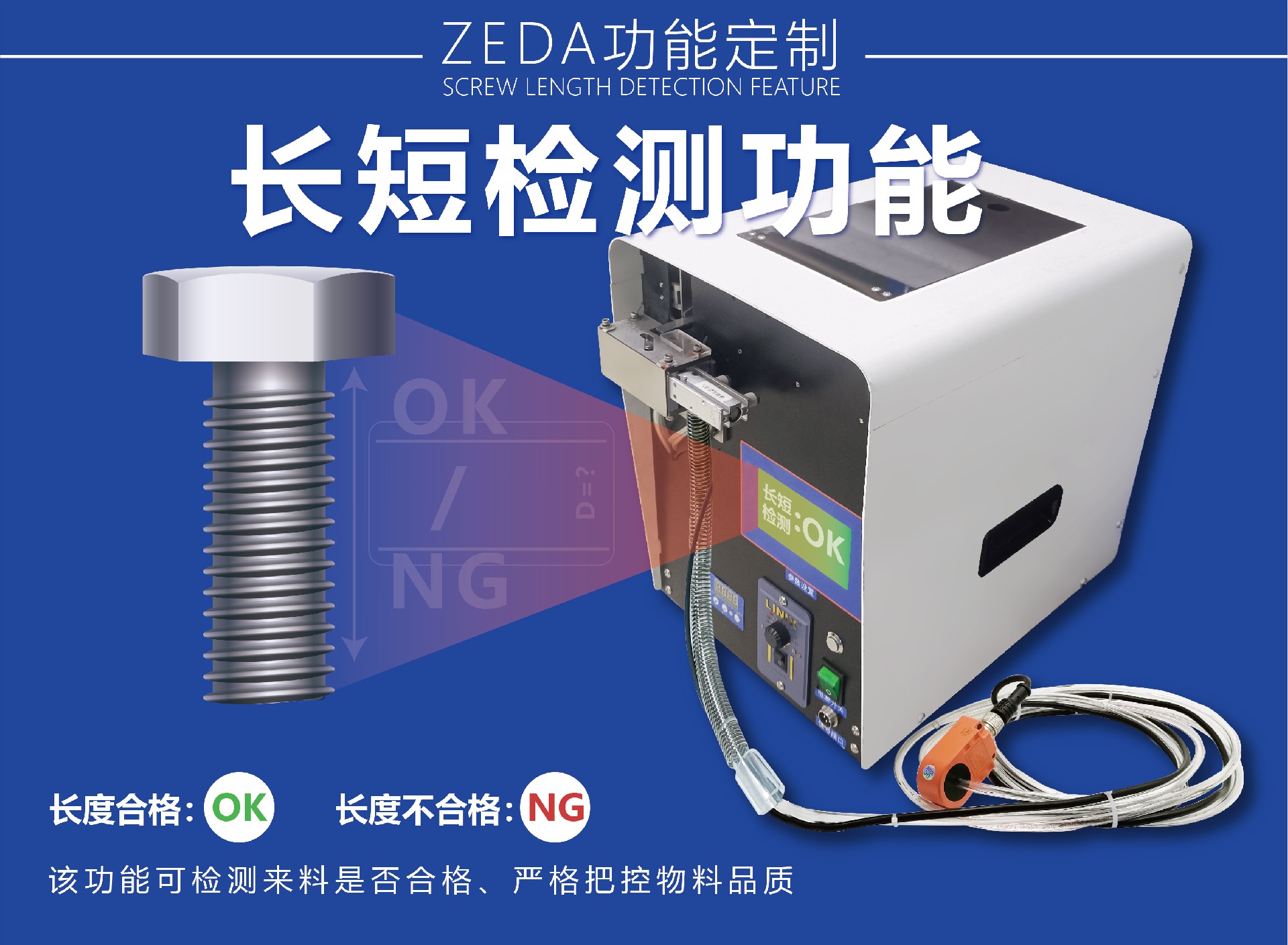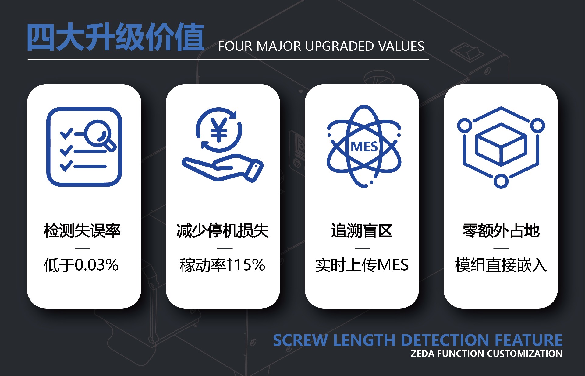 ①檢測失誤率低于0.03%:短螺絲/長螺絲>99.9%攔截,滑牙、卡機、不良螺絲統統說拜拜。